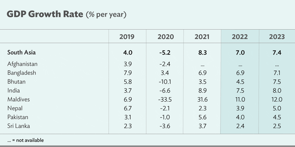 एडिबीले बुधबार आउटलुक २०२२ सार्वजनिक गर्दै यस्तो प्रक्षेपण गरेको हो । एडीबीले गरेको यो प्रक्षेपण विश्व बैंकको प्रक्षेपणसँग मिलेको छ । नेपाल सरकारले भने बजेटमा ७ प्रतिशतको आर्थिक वृद्धिदर प्राप्त हुने अनुमान गरेको छ ।