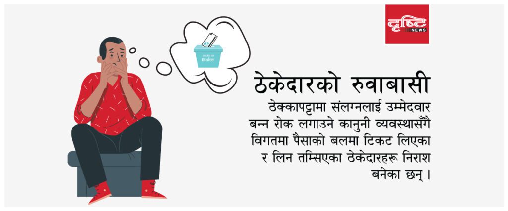 ठेक्कापट्टामा संलग्नलाई उम्मेदवार बन्न रोक लगाउने कानुनी व्यवस्थासँगै विगतमा पैसाको बलमा टिकट लिएका र लिन तम्सिएका ठेकेदारहरू निराश बनेका छन् ।