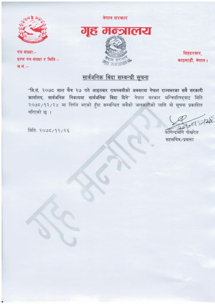 चैते दसँै रामनवमीको अवसरमा नेपाल राज्यभरका सबै सरकारी कार्यालय, सार्वजनिक निकायमा सार्वजनिक बिदा दिने मन्त्रिपरिषद्को बैठकले निर्णय गरेको गृह मन्त्रालयका प्रवक्ता फणीन्द्रमणि पोखरेलद्वारा जारी विज्ञप्तिमा जनाएको छ ।