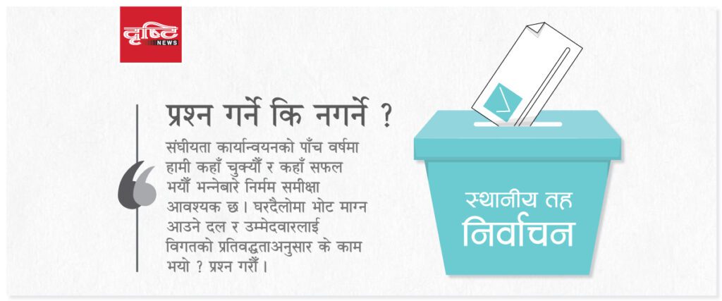 संघीयता कार्यान्वयनको पाँच वर्षमा हामी कहाँ चुक्यौँ र कहाँ सफल भयौँ भन्नेबारे निर्मम समीक्षा आवश्यक छ । घरदैलोमा भोट माग्न आउने दल र उम्मेदवारलाई विगतको प्रतिवद्धताअनुसार के काम भयो ? प्रश्न गरौँ ।
