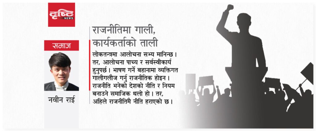 लोकतन्त्रमा आलोचना सभ्य मानिन्छ । तर, आलोचना पाच्य र सर्वस्वीकार्य हुनुपर्छ । भाषण गर्ने बहानामा व्यक्तिगत गालीगलौज गर्नु राजनीतिक होइन । राजनीति भनेको देशको नीति र नियम बनाउने समाजिक थलो हो । तर, अहिले राजनीतिमै नीति हराएको छ ।