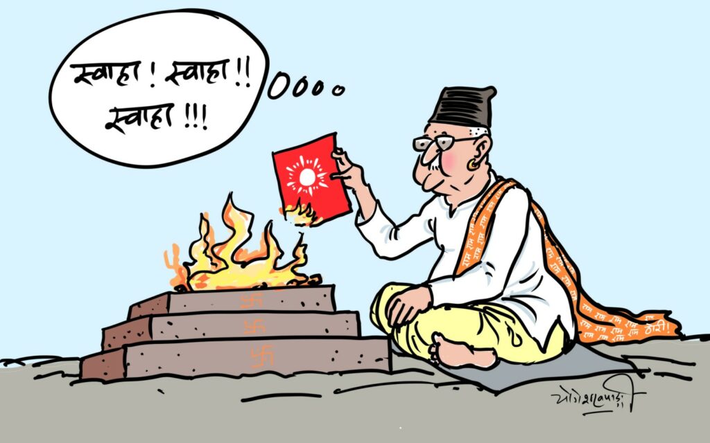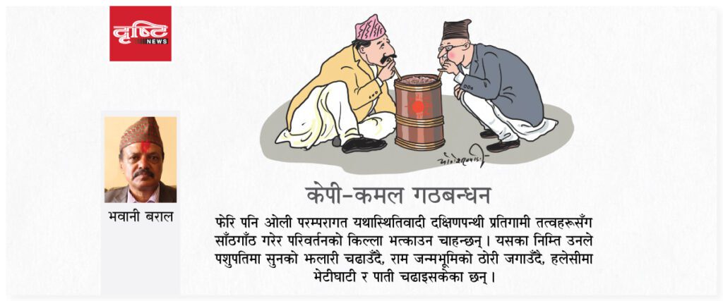 फेरि पनि ओली परम्परागत यथास्थितिवादी दक्षिणपन्थी प्रतिगामी तत्वहरुसँग साँठगाँठ गरेर परिवर्तनको किल्ला भत्काउन चाहन्छन् । यसका निम्ति उनले पशुपतिमा सुनको झलारी चढाउँदै, राम जन्मभूमिको ठोरी जगाउँदै, हलेसीमा भेटीघाटी र पाती चढाइसकेका छन् ।