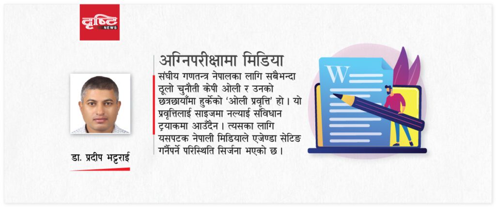 अब प्रश्न उठछ्, नेपाली मिडियाले केन्द्रमा ल्याउनुपर्ने विषय के–के हुन् र किनारमा धकेल्नुपर्ने विषय के–के हुन् ? यी दुवैखाले विषयलाई ध्यानमा लिनुपर्दा नेपाली मिडियाले के कुरा बिर्सनु हुँदैन भने अहिलेको संघीय गणतन्त्र नेपालका लागि सबैभन्दा ठूलो चुनौती केपी शर्मा ओली र उनको छत्रछायाँमा हुर्केको–झ्यांगिएको ओली प्रवृत्ति हो । कसैले चाहे पनि नचाहे पनि यो प्रवृत्ति अहिले कमजोर छैन । केही समय पहिले यही प्रवृत्तिलाई परास्त गरेर उनीभन्दा सैद्धान्तिकरूपमा कम खराब गठबन्धन बनाएर संविधानलाई ट्रयाकमा ल्याउने काम भएको छ ।