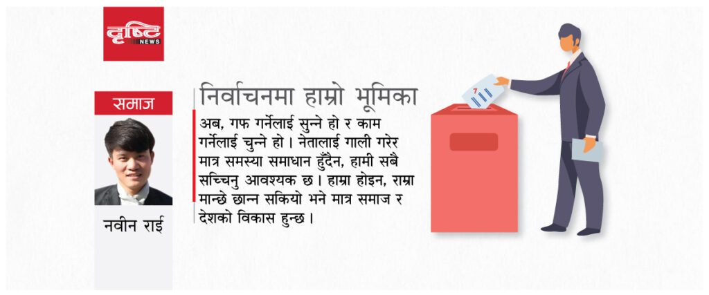 अब, गफ गर्नेलाई सुन्ने हो र काम गर्नेलाई चुन्ने हो । नेतालाई गाली गरेरमात्र समस्या समाधान हुँदैन, हामी सबै सच्चिनु आवश्यक छ । हाम्रा होइन, राम्रा मान्छे छान्न सकियो भने मात्र समाज र देशको विकास हुन्छ ।