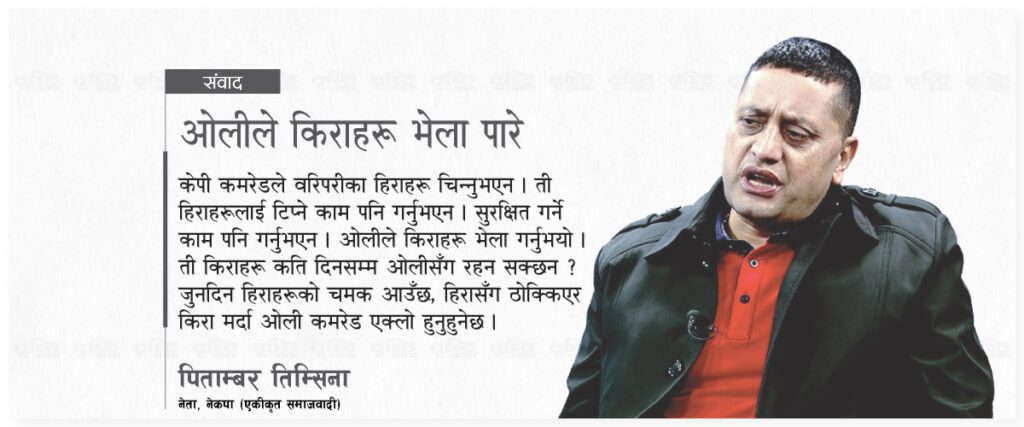ओलीलाई २५ वर्षदेखि निरन्तर साथ दिँदै आएका पिताम्बर तिम्सिनाले पनि एमालेबाट विद्रोह गरेका छन् । राष्ट्रिय खेलकुद परिषदका पूर्व उपाध्यक्ष, नेपाल ओलम्पिक कमिटीका उपमहासचिव रहेका तिम्सिना सयौँ खेलकर्मीसहित नेकपा (एकीकृत समाजवादीमा) आवद्ध भएका छन् । खेलकुदको राजनीतिमा निकै सक्रिय र प्रभावशाली व्यक्तित्वको रुपमा चिनिने तिम्सिनासँग दृष्टिले गरेको कुराकानी प्रस्तुत छः