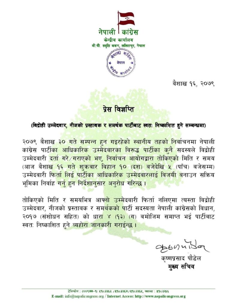 ‘तोकिएको मिति र समयभित्र आफ्नो उम्मेदवारी फिर्ता नलिएमा त्यस्ता विद्रोही उम्मेदवार, निजको प्रस्तावक र समर्थकको पार्टी सदस्यता नेपाली कांग्रेसको विधान, २०१७ (संशोधन सहित) को धारा ४ ९१३० ९ग० बमोजिम समाप्त भई पार्टीबाट स्वतः निष्काशित हुने व्यहोरा जानकारी गराइन्छ’, विज्ञप्तिमा भनिएको छ ।