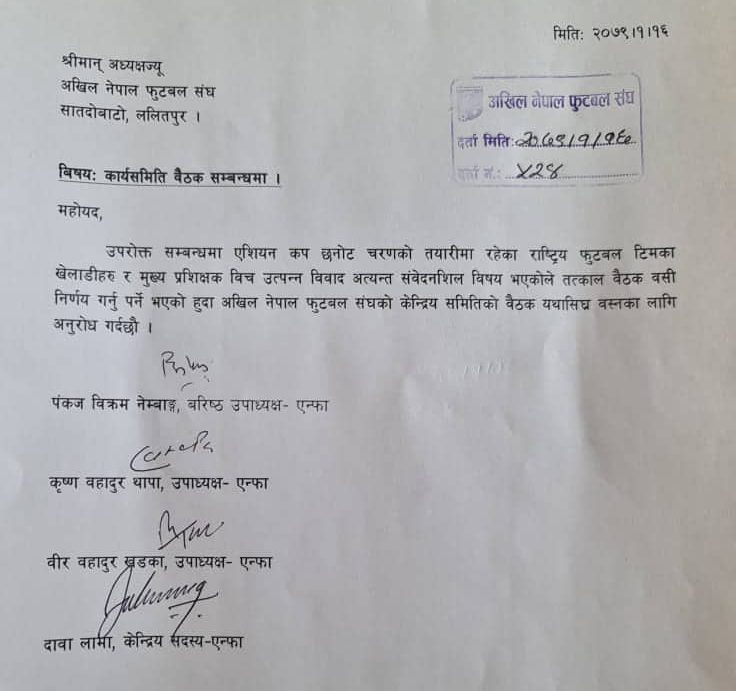 राष्ट्रिय फुटबल टिमका खेलाडी र मुख्य प्रशिक्षकबीच उत्पन्न विवाद अत्यन्त संवेदनशील विषय भएको भन्दै वरिष्ठ उपाध्यक्ष पंकजबिक्रम नेम्वाङ, उपाध्यक्षद्वय कृष्णबहादुर थापा, वीरबहादुर खड्का र केन्द्रिय सदस्य दावा लामाले बैठक माग गरेका हुन् । उनीहरुले शुक्रबार विज्ञप्ति जारी गर्दै खेलाडी र प्रशिक्षकको विवाद तत्काल बैठक बसेर निर्णय गर्नुपर्ने माग गरेका हुन् ।