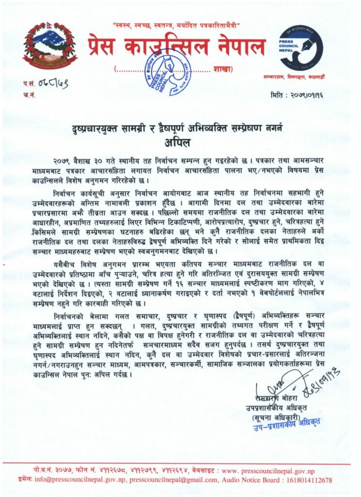 स्थानीय तह निर्वाचनको संघारमा विभिन्न उम्मेदवार लक्षित त्यस्ता सामाग्री सम्प्रेषण भएका गुनासा, उजुरीहरु आइरहेको भन्दै शुक्रबार काउन्सिलले यस्तो अपिल जारी गरेको हो ।