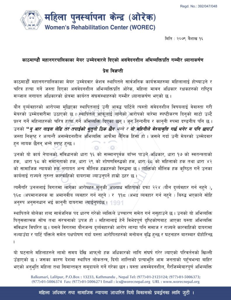 काठमाडौं । काठमाडौंका मेयरका उम्मेदवार केशव स्थापितको अभिव्यक्तप्रति महिला मानवअधिकार संघ संस्थाहरूले आपत्ति जनाउँदै कारबाहीको माग गरेका छन् ।