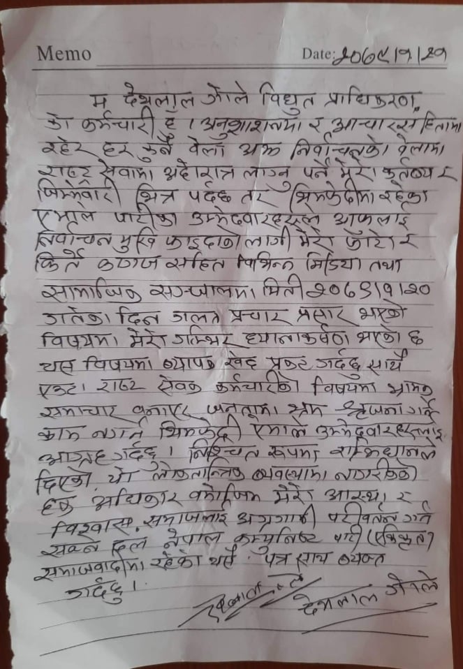 बु्धबार वक्तव्य जारी गर्दै गोलेले आफ्नो किर्ते दस्तखतसहित चुनावी प्रपोगान्डा गरिएको आरोप लगाए । उनले वक्तव्यमा भनेका छन्, ‘भिमफेदीमा रहेका एमाले उम्मेदावरले आफुलाई निर्वाचनमुखी फाइदाका लागि मेरो फोटो र किर्ते कागजातसहित विभिन्न मिडिया तथा सामाजिक सञ्जालमा गलत प्रचारप्रसार भएको विषयमा गम्भीर ध्यानाकर्षण भएको छ, यस विषयमा म खेद प्रकट गर्दछु ।’