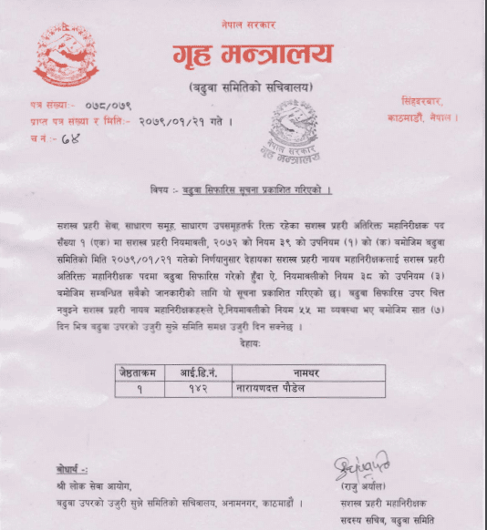 काठमाडौं । सशस्त्र प्रहरी बलको रिक्त एआइजी पदमा नारायणदत्त पौडेलको सिफारिस भएको छ । सशस्त्रमा एआइजीका दुई पद रिक्त भएपनि एकमा मात्र सिफारिस भएको छ ।