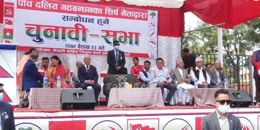बुटवलको देवीनगर चौपारीमा आयोजना गरेको सभामा प्रधानमन्त्री तथा काँग्रेस सभापति देउवा, पूर्वप्रधानमन्त्री तथा नेकपा एकीकृत समाजवादीका अध्यक्ष माधवकुमार नेपाल, कांग्रेस नेता रामचन्द्र पौडेल, महामन्त्री गगनकुमार थापा, केन्द्रीय सदस्य तथा गृहमन्त्री बालकृष्ण खाँण लगायत पाँच वटै दलका नेताहरुले सम्बोधन गर्नेछन् ।