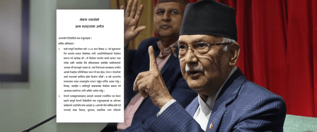 यसैबीच, आइतबार एमाले अध्यक्ष ओलीले विशेष पत्रकार सम्मेलन गर्दै मत माग्न अपिल जारी गरे । ओलीको अपिल पनि कांग्रेसविरुद्ध भडासले भरिएको थियो ।