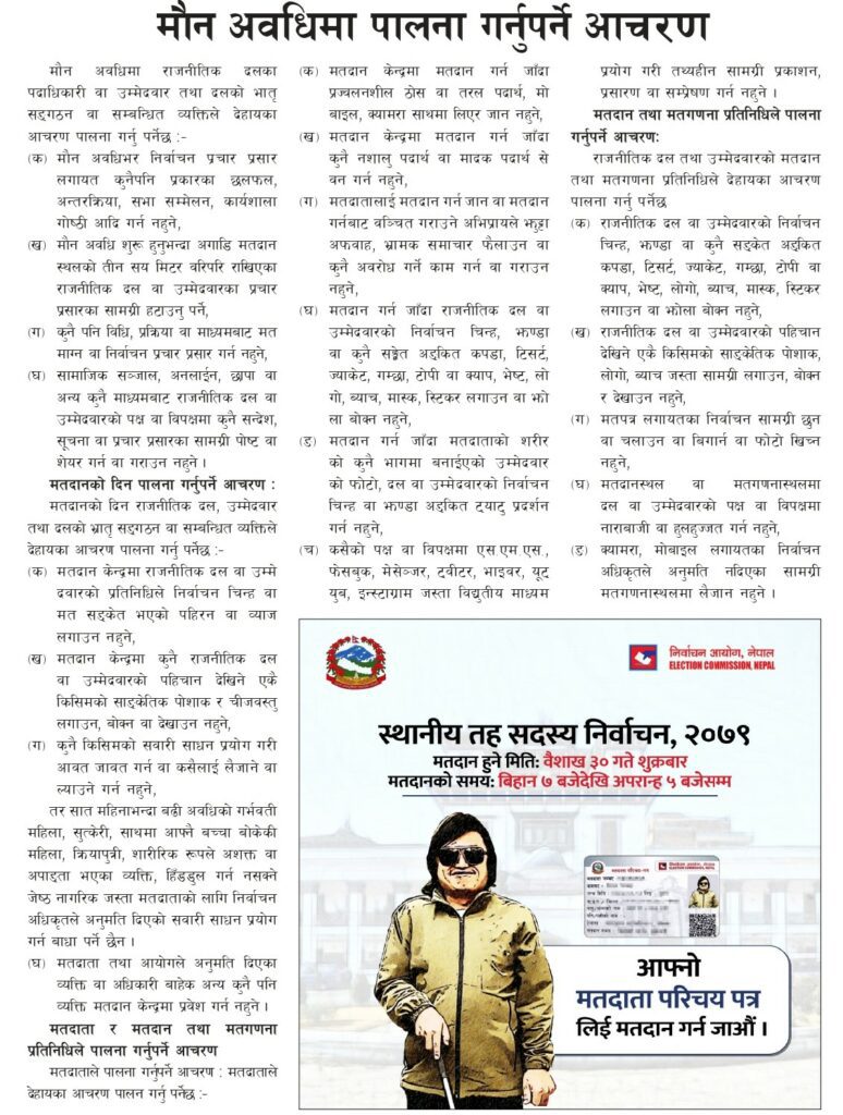 काठमाडौं । वैशाख ३० गते शुक्रबार हुने स्थानीय तह निर्वाचनका लागि आज मंगलबार रातिदेखि मौन अवधि लागू हुँदैछ । मौन अवधिमा प्रचार प्रसारलगाायतका गतिविधिमा निर्वाचन आचारसंहिता लागू हुने निर्वाचन आयोगका प्रवक्ता शालिग्राम शर्मा पौडेलले जानकारी दिए । आचारसंहिता उल्लंघन गरेको पाइए आयोगले कारबाही गर्नेछ । यस अवधिमा निर्वाचन प्रचारप्रसार गर्न र मत माग्न पाइने छैन ।