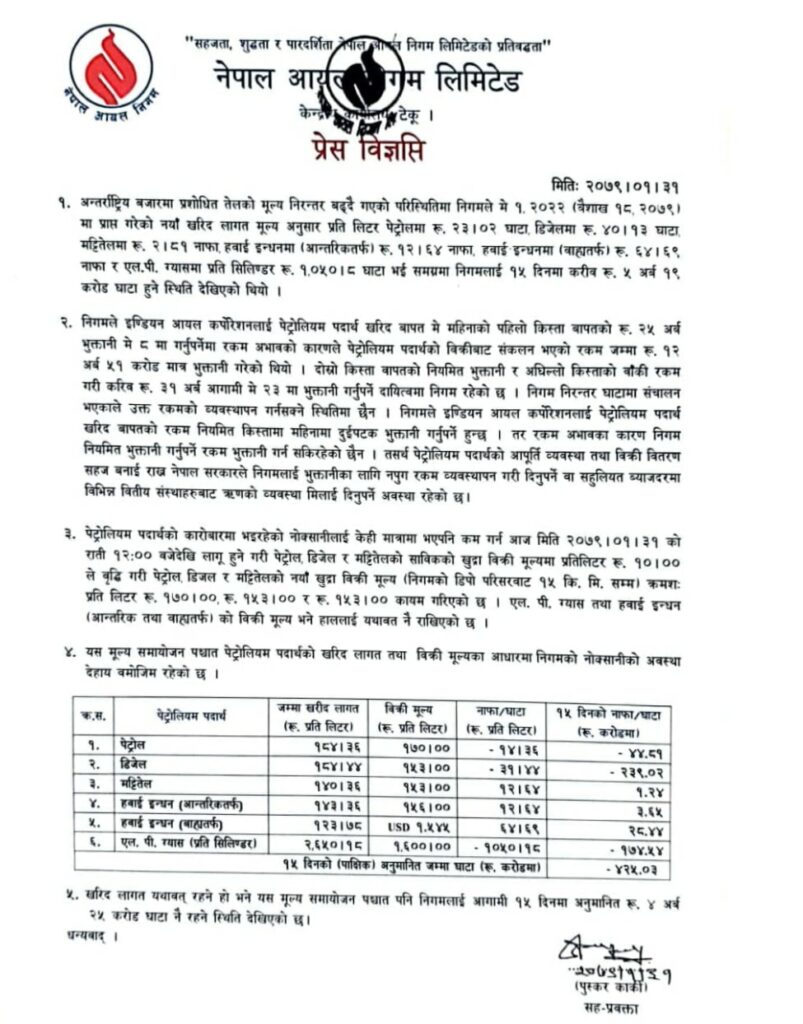मूल्य बढेपनि निगमलाई पेट्रोलमा प्रतिलिटर १४.३६ रुपैयाँ र डिजेलमा प्रतिलिटर ३१.४४ रुपैयाँ नोक्सान छ। नयाँ मूल्य आज मध्यरात पश्चात् लागू हुनेछ ।