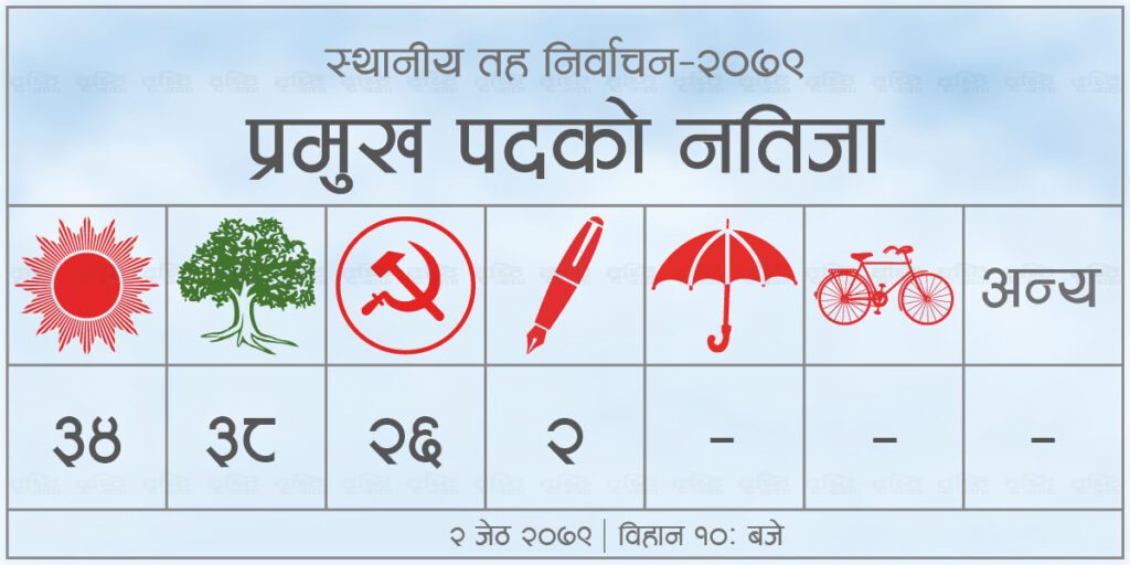 पछिल्लो मतपरिणाम अनुसार नेकपा एमालेले ३४ र नेपाली कांग्रसले ३८ वटा पालिकाको प्रमुखमा जित हासिल गरेको छ ।