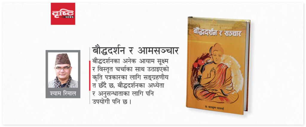 बौद्धदर्शनका अनेक आयाम सूक्ष्म र विस्तृत चर्चाका साथ उठाइएको कृति पत्रकारका लागि सङ्ग्रहणीय त छँदै छ, बौद्धदर्शनका अध्येता र अनुसन्धाताका लागि पनि उपयोगी पनि छ । विद्यावारिधिमा प्रक्रिया पुर्याउन लेखिने अनेक प्रसङ्ग अहिले कृतिका रूपमा ल्याउँदा हटाइदिएको भए धेरै पृष्ठ छोटिने कुरालाई लेखकले हेक्का राख्न सक्नुपथ्र्याे ।
