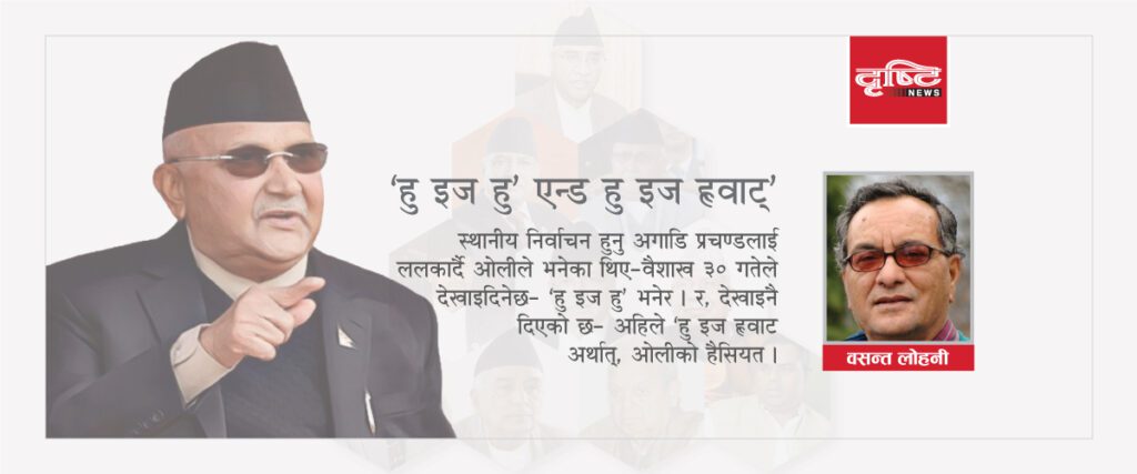 स्थानीय निर्वाचन हुनु अगाडि ओलीले दुइटा कुरा भनेका थिए– प्रचण्डलाई ललकार्दै । पहिलो– वैशाख ३० गतेले देखाइदिनेछ– ‘हु इज हु’ भनेर । र, देखाइनै दिएको छ– अहिले ‘हु इज ह्वाट’ अर्थात्, ओलीको हैसियत ।