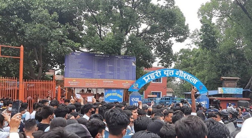विद्यार्थीहरुले दोषीलाई कारबाहीको माग गर्दै प्रहरी कार्यालयअघि प्रदर्शन गरिरहेका छन् ।