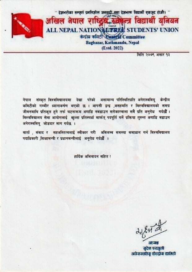 काठमाडौं । नेपाल संस्कृत विश्वविद्यालय सेवा आयोगलाई खुला प्रतिस्पर्धामार्फत् पदपुर्ति गर्ने प्रक्रिया तत्काल अघि बढाउन अनेराश्ववियूले माग गरेको छ ।