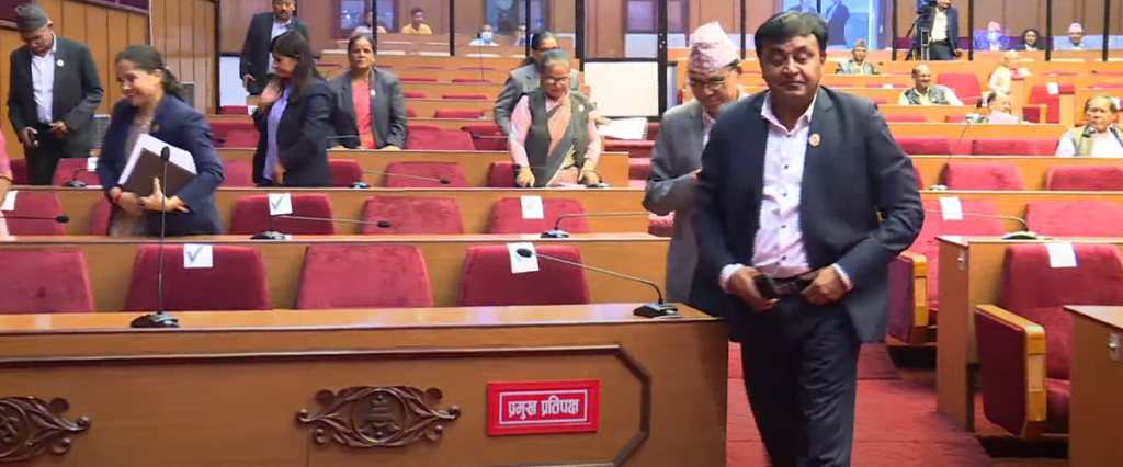 राष्ट्रियसभाका अध्यक्ष गणेश तिमिल्सिनाले अर्थमन्त्री शर्मालाई बजेटको विषयमा उठेका प्रश्नको जवाफ दिन बोलाएपछि आसनबाट उठेर राष्ट्रिसभा सदस्य देवेन्द्र पौडेलले अर्थमन्त्रीमाथि प्रश्न उठेकाले आफूहरु अर्थमन्त्रीले जवाफ दिने बैठकमा सहभागी नहुने बताए ।