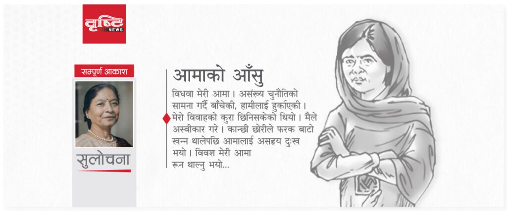 मेरी दिदीको बिहे पनि त्यसरी नै भइसकेको थियो । मेरो अभिभावक, ‘ईश्वर’ जे भने पनि सबै मेरी विधवा आमा नै हुनुहुन्थ्यो । २६ वर्षकै उमेरदेखि विधवा भएर आफ्ना बच्चाहरु च्यापेर, समाजका असंख्य चुनौतिहरुसँग सामना गर्दै बाँचेकी …। धेरै माया गरेकी कान्छी छोरीले फरक बाटो खन्न थालेपछि आमालाई असह्य दुःख भयो ।