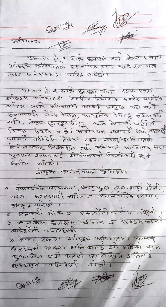 ४. नेकपा एकता राष्ट्रिय अभियानमा आबद्ध दलहरुको आडमा शक्ति बनाई सो शक्तिको चरम दुरुपयोग गरी उल्लेखित शक्तिहरुलाई सिध्याउने गतिविधि गरिएको ।