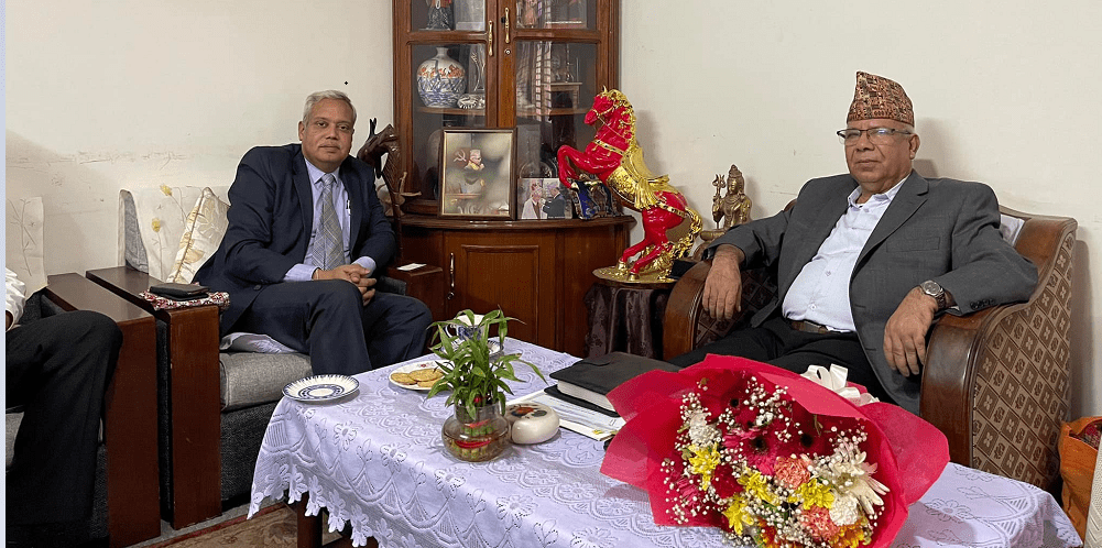 काठमाडौं । सत्ता सझेद्र दल नेकपा (एकीकृत समाजवादी)का अध्यक्ष माधवकुमार नेपाल र भारतीय नवनियुक्त राजदूत नवीन श्रीवास्तववीच भेटघाट भएको छ । अध्यक्ष नेपाललाई भेट्न राजदूत श्रीवास्तव शनिबार बेलुकी उनको निजी निवास कोटेश्वरमा पुगेका हुन् ।