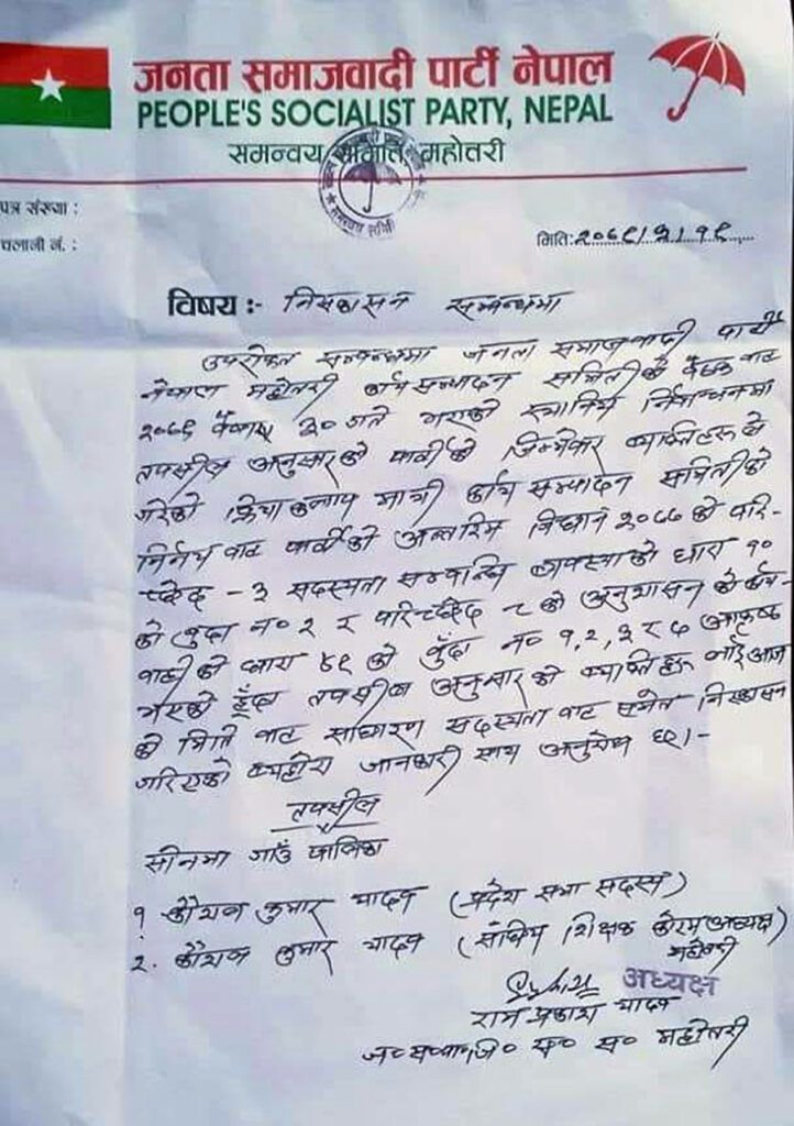 उनलाई साधारण सदस्यतावाट समेत निष्काषन गरेको जिल्ला अध्यक्ष रामप्रकाश यादवले जारी गरेको बिज्ञप्तिमा उल्लेख छ ।