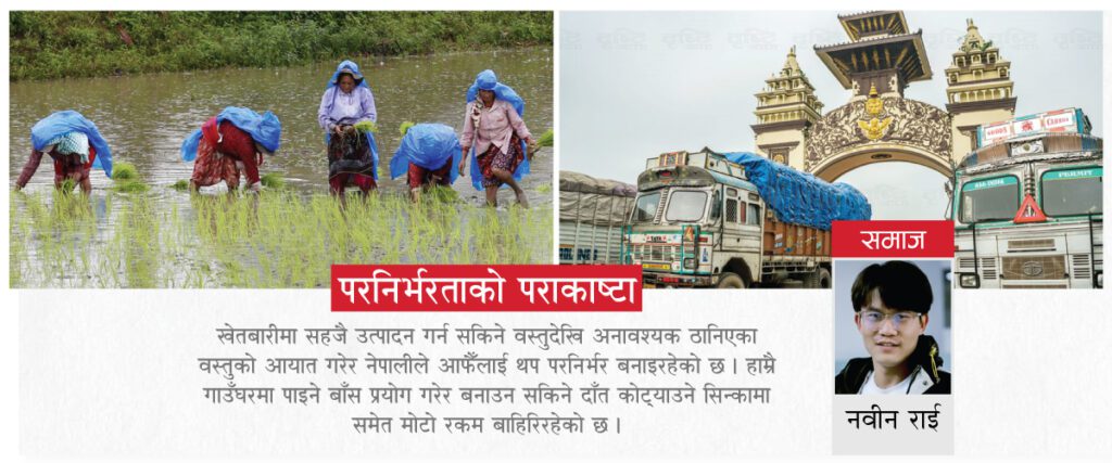 खेतबारीमा सहजै उत्पादन गर्न सकिने वस्तुदेखि अनावश्यक ठानिएका वस्तुको आयात गरेर नेपालीले आफैँलाई थप परनिर्भर बनाइरहेकाे छ । हाम्रै गाउँघरमा पाइने बाँस प्रयोग गरेर बनाउन सकिने दाँत कोट्याउने सिन्कामा समेत मोटो रकम बाहिरिरहेकाे छ ।