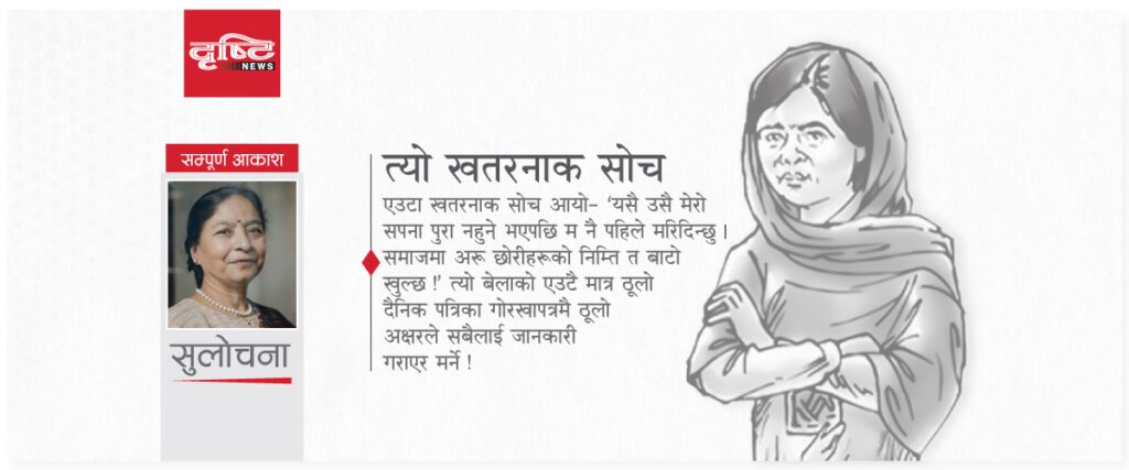 अनि भने ममा एउटा खतरनाक सोच आयो– ‘यसै उसै मेरो सपना पुरा नहुने भएपछि म नै पहिले मरिदिन्छु । समाजमा अरु छोरीहरुको निम्ति त बाटो खुल्छ !’