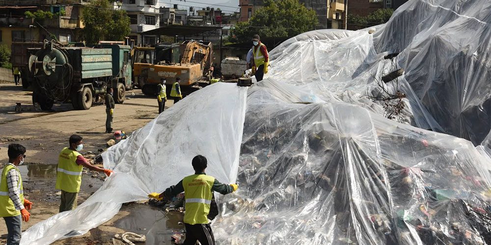 काठमाडौं । काठमाडौं महानगरले टेकुमा थुप्रिएको फोहोर प्लास्टिकले छोपेको छ ।