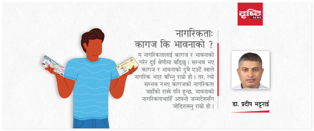 यो स्तम्भकार नागरिकतालाई कागजको र भावनाको गरेर दुई श्रेणीमा बाँड्छ । सम्भव भए कागजको पनि र भावनाको दुवै एउटै खाले नागरिक भएर एक जुनी बाँच्नु राम्रो हो । तर, त्यो सम्भव नभए कागजको नागरिकता जहाँको राखे पनि हुन्छ, भावनाको नागरिकताचाहिँ आफ्नो जन्मदेशसँग जोडिराख्नु राम्रो हो ।