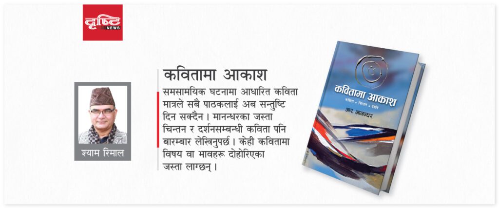 कवि आर मानन्धरको गत वर्ष फागुनमा प्रकाशित ‘कवितामा आकाश’ (मञ्जरी, २०७८) काव्यकृतिले आकाशलाई विविध रूपबाट हेरेको छ । यसले पाठकलाई बेग्लै खालको स्वाद दिन्छ ।