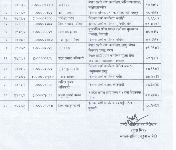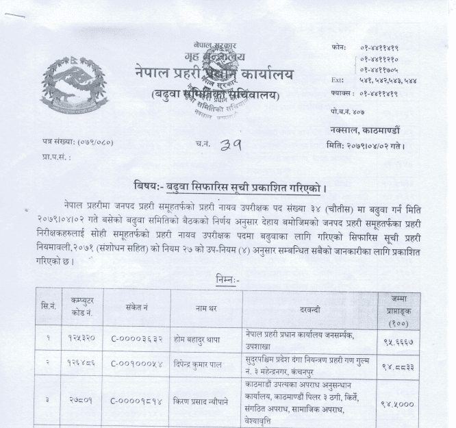 काठमाडौं । नेपाल प्रहरीका ३४ इन्सपेक्टरको डिएसपी बढुवामा सिफारिस भएको छ । सोमबार बसेको बढुवा सिफारिस समितिको बैठकले सिफारिस गरेको हो ।