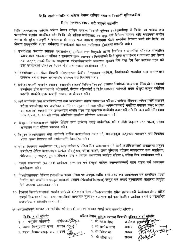 त्यस्तै ती तहका निरन्तर पाठ्यक्रम परिमार्जनका लागि आवश्यक सुझाव दिन पन्ध्र दिनभित्र कार्यदल गठन गरी आगामी पुससम्म कार्यान्वयन गर्ने, विश्वविद्यालयमा रहेका विद्यार्थी संगठनहरुका केन्द्रीय नेतृत्वसँग स्ववियु निर्वाचनको सन्दर्भमा भदौ मसान्तसम्म छलफल गर्ने पनि सहमति भएको छ ।