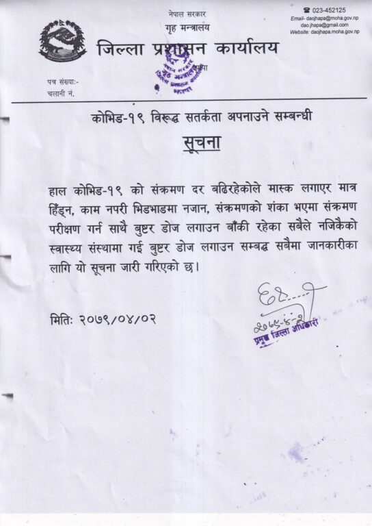 झापा । जिल्लाका सबै स्थानीय तह, स्वास्थ्य संस्था, नेपाल रेडक्रस सोसाइटीलगायतका सरकारी तथा गैरसरकारी सङ्घसंस्थालाई कोभिड–१९ को सङ्क्रमणविरुद्ध सचेतना अभिवृद्धि गर्नका लागि आग्रह गरिएको छ ।