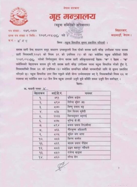 गृह मन्त्रालय बढुवा समितिको सचिवालयका अनुसार यही साउन ६ गतेको निर्णयबमोजिम उनीहरुलाई प्रहरी नियमावली २०७२ को नियम ३९ को उपनियम १ को (ख) मबोजिम जेष्ठता क्रम कायम हुनेगरि बढुवा सिफारिस गरिएको हो।