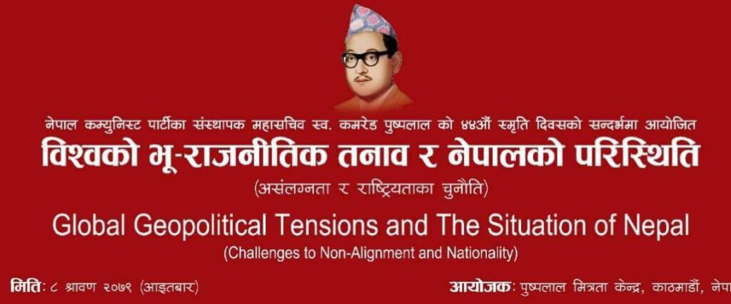 नेपाल कम्युनिष्ट पार्टीका संस्थापक महासचिव पुष्पलाल श्रेष्ठको ४४औँ स्मृति दिवसको अवसरमा पुष्पलाल मित्रता केन्द्रले आयोजना गर्न लागेको ‘विश्वको भूराजनीतिक तनाव र नेपालको परिस्थिति’ विषयक जनबहसमा एकीकृत समाजवादीका अध्यक्ष नेपाल, माओवादी केन्द्रका अध्यक्ष प्रचण्ड, पूर्वमहान्यायाधिवक्ता डा. संग्रौला, चीनका लागि पूर्वनेपाली राजदूत डा. महेश मास्के, डा.खगेन्द्र प्रसाईलगायतले सम्बोधन गर्ने कार्यक्रम रहेको आयोजक संस्थाका अध्यक्ष तथा नेकपा एकीकृत समाजवादी पार्टीका उपमहासचिव जगन्नाथ खतिवडाले बताए ।