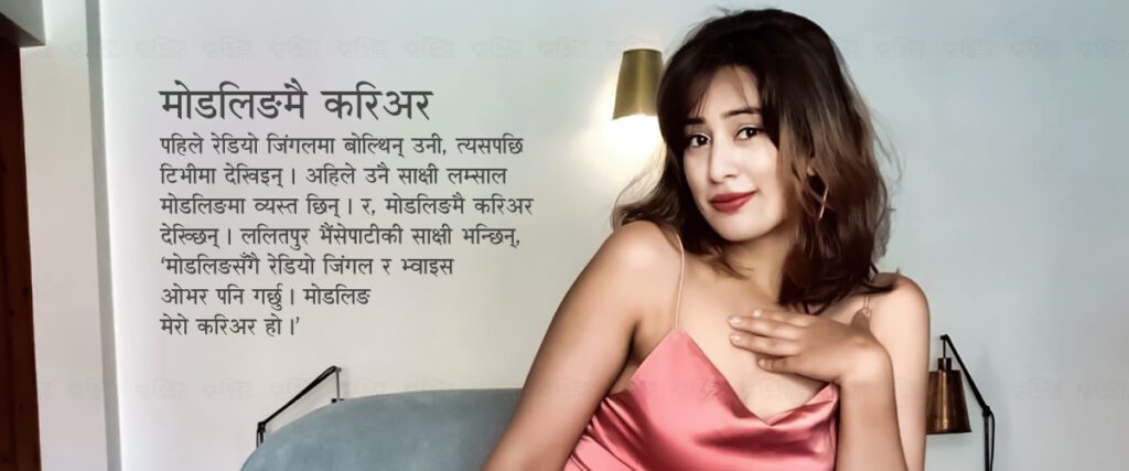 मोडलिङलाई करिअरका रुपमा लिएकी ललितपुर भैंसेपाटीकी साक्षी भन्छिन्, ‘सुरुमा रहरले मोडलिङ अँगालँ, अहिले करिअरकै रुपमा लिएकी छु ।’ तीन दर्जनभन्दा बढी म्युजिक भिडियो, शर्ट फिल्म र उतिकै संख्यामा रेडियो जिंगलमा ‘भ्वाइस ओभर’ गरिसकेकी साक्षीले केही भारतीय शर्ट फिल्ममा पनि अभिनय गरेकी छन् । मोडल साक्षी लम्सालसँग एमपी सुब्बाको जम्काभेट :