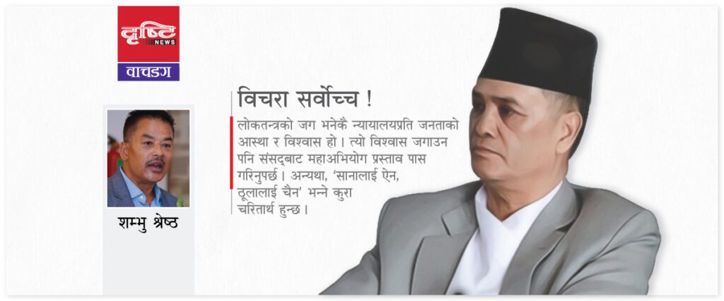 लोकतन्त्रको जग भनेकै न्यायालयप्रति जनताको आस्था र विश्वास हो । त्यो विश्वास जगाउन पनि संसद्बाट महाअभियोग प्रस्ताव पास गरिनुपर्छ । अन्यथा, ‘सानालाई ऐन, ठूलालाई चैन’ भन्ने कुरा चरितार्थ हुन्छ ।