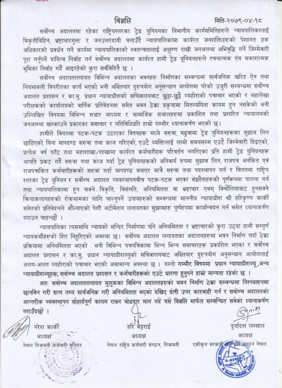 न्यायपालिका त्यसमाथि न्यायको मन्दिर निर्माणमा पनि अनियमितता र भ्रष्टाचारको कुरा उठ्दा सम्पुर्ण न्यायकर्मीहरुको शिर निहुरिएको भन्दै सर्वोच्च अदालत लगायतका अदालतहरुमा भवन निर्माण गर्दा ठेक्का प्रक्रियामा अनियमितता भएको भनी विभिन्न पत्रपत्रिकामा भिन्न भिन्न समाचारहरू प्रकाशित भएका र सर्वोच्च अदालत प्रशासन र का.मु. प्रधान न्यायाधीशज्युको सचिवालयबाट अख्तियार दुरुपयोग अनुसन्धान आयोगलाई अलग–अलग व्यहोराको पत्राचार हुनु असामान्य अवस्था भनिएको छ । ‘यस्तो गम्भीर बिषयमा प्रधान न्यायाधीशज्यू ,अन्य न्यायाधीशज्यूहरू, सर्वोच्च अदालत प्रशासन र कर्मचारीहरूको एउटै धारणा हुनुपर्ने हाम्रो मान्यता रहेको छ,’ बिज्ञप्तीमा भनिएको छ,‘अतः सर्वोच्च अदालतलगायत मुलुकका बिभिन्न अदालतहरुको भवन निर्माण ठेक्का सम्बन्धमा निस्पक्षरुपमा छानविन गरी सत्य तथ्य सार्वजनिक गरी अनियमितता भएको देखिए दोषी उपर कारवाही गर्न र सर्वोच्च अदालतको आन्तरीक व्यवस्थापन सौहार्दपूर्ण कायम राख्न जोडदार माग गर्दै यसै विज्ञप्ति मार्फत सम्बन्धित सवैको ध्यानाकर्षण गराउँदछौं ।’