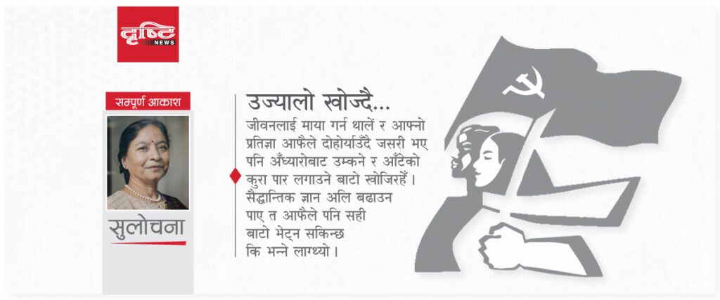 जीवनकै सूवर्ण समय त्यसरी गुज्रिरहँदा बेला बेलामा ‘यो म ठीक गर्दैछु कि बेठीक ?’ भन्ने प्रश्न मनमा आइरहन्थ्यो । एकजना शुभचिन्तक साथी पार्वती माया गर्दै भन्थिन्– ‘सुलो, तिमी एकजनाले समाज फेर्छु भनेर हुन्छ र ? छोडिदेऊ त्यो स्कूल…’