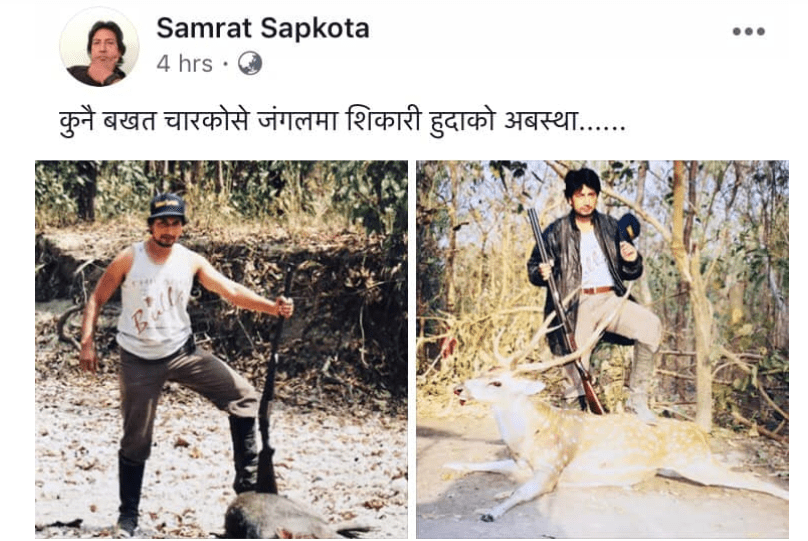 गत बुधबार सापकोटाले हातमा बन्दुक समातेको र अगाडि मरेको चित्तल र हरिणसहितको तस्बिर फेसबुकमा राख्दै ‘कुनै समय चारकोसे झाडीमा सिकारी हुँदाको अवस्था…’ भनेर पोस्ट गरेका थिए । सोही पोस्टलाई लिएर प्रहरी र वन कार्यालयमा उजुरी परेपछि उनीमाथि छानबिन भएको थियो । विवाद भएपछि उनले सो तस्बिर हटाएका थिए ।