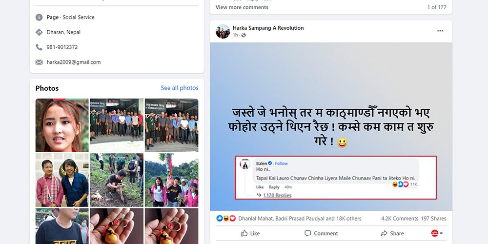 रमाईलो त के भयो भने निक्कै तौलेर मात्र लेख्ने बोल्ने काठमाडौंका मेयर बालेन्द्रले हर्कको स्टाटसमा कमेन्ट लेखे– ‘हो नि… तपाईकै लौरो चुनाव चिन्ह लिएर मैले चुनाव पनि त जितेको हो नि ।’