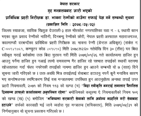 पेशाले डेन्टल डा. भावना प्रहरी अस्पतालमा कार्यरत थिइन् । उनी दिन महिनादेखि हाजिर नभएको गृह मन्त्रालयले जनाएको छ । सात दिन भित्र उपस्थित नभए बर्खास्त गरिने भन्दै गृह मन्त्रालयले बिहीबार सूचना निकालेको छ ।
