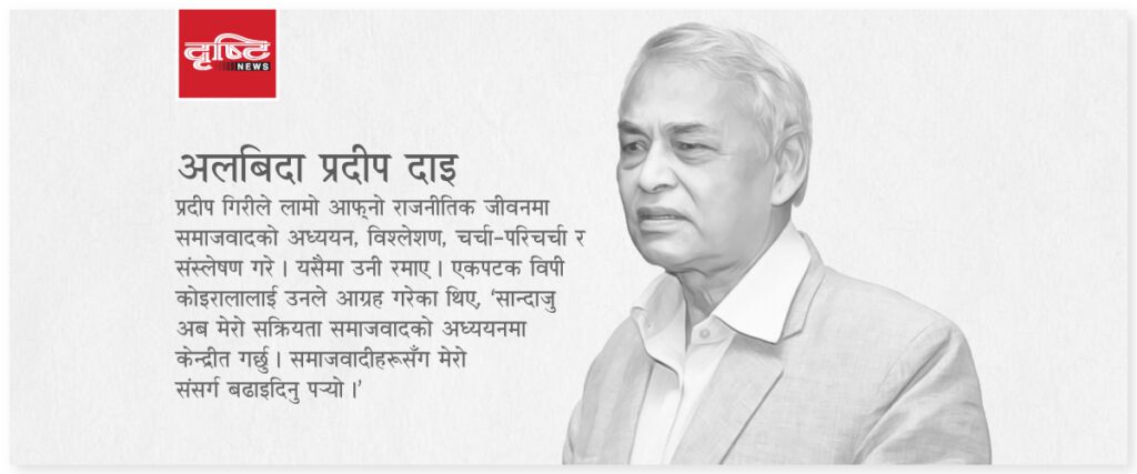 प्रदीप गिरीले लामो आफ्नो राजनीतिक जीवनमा समाजवादको अध्ययन, विश्लेशण, चर्चा–परिचर्चा र संस्लेषण गरे । यसैमा उनी रमाए । एकपटक विपी कोइरालालाई उनले आग्रह गरेका थिए, ‘सान्दाजु अब मेरो सक्रियता समाजवादको अध्ययनमा केन्द्रीत गर्छु । समाजवादीहरुसँग मेरो संसर्ग बढाइदिनु प¥यो ।’