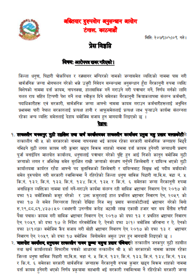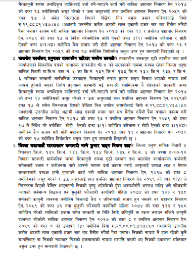 गुठीका तत्कालिन हाकिम मधु बाँस्तोकोटी, मालपोत नासु यमुना पंजियार, खरिदार जगदेव कामती र अन्य जग्गा जफतका लागि प्रतिवादी बनाइएको छ । २९ करोड ८८ लाख बिगो कायम गरी मुद्दा दायर गरिएको छ ।
