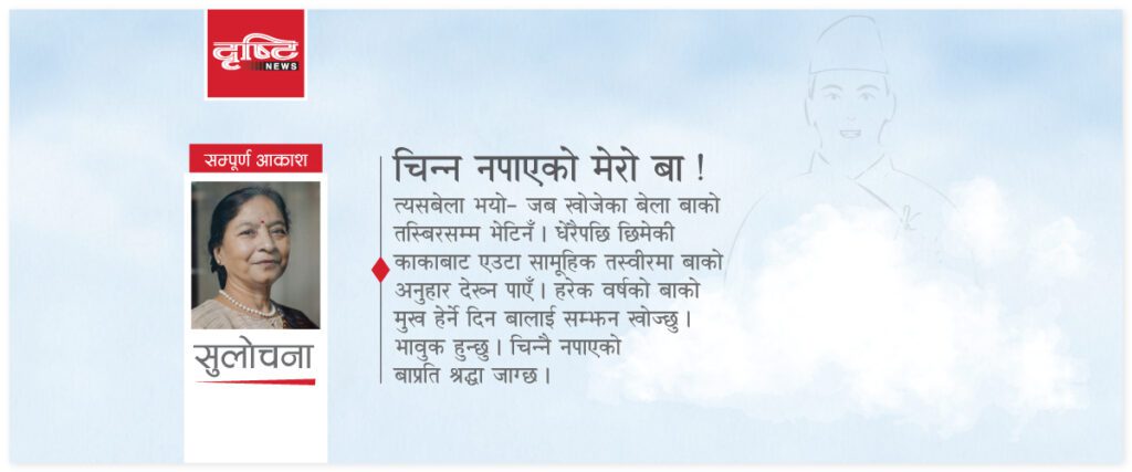 खपिनसक्नु पीडा त त्यसबेला भयो– जब खोजेका बेला बाको तस्बिरसम्म पनि भेटिनँ । धेरैपछि टोल छिमेकका काकाबाटै एउटा सामूहिक तस्वीरमा बाको अनुहार देख्न पाएँ । हरेक वर्षको बाको मुख हेर्ने दिन आउँदा बालाई सम्झन खोज्छु । भावुक हुन्छु । चिन्नै नपाएको बाप्रति श्रद्धा जाग्छ ।