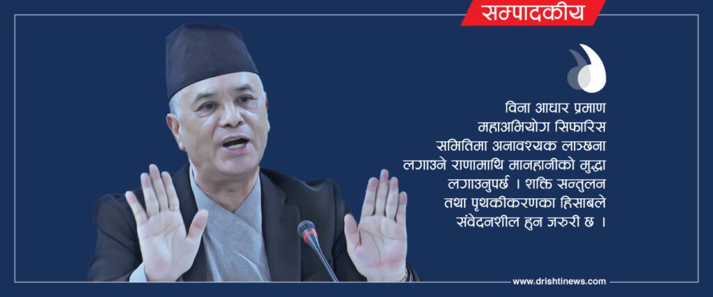 विना आधार प्रमाण महाअभियोग सिफारिस समितिमा अनावश्यक लाञ्छना लगाउने राणामाथि मानहानीको मुद्धा लगाउनुपर्छ । शक्ति सन्तुलन तथा पृथकीकरणका हिसाबले संवेदनशील हुन जरुरी छ ।